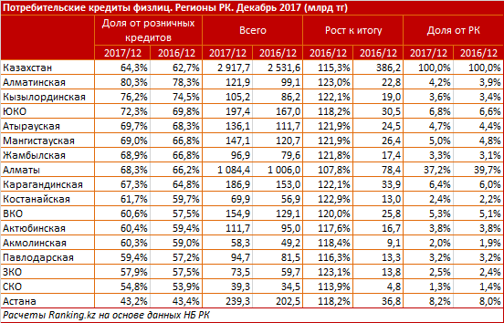 На третьем месте ЮКО с долей потребкредитов физлиц от всего объема розничных кредитов 72,3 процента. Объем вырос за 2017 год на 18,2 процента (30,5 миллиарда тенге), до 197,4 миллиарда тенге. Доля от РК выросла с 6,6 процента до 6,8 процента.
