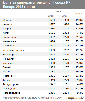 Следом идут Алматы - 1 627 тенге за килограмм (+14,6 процента) и Атырау - 1 530 тенге (+17 процентов).