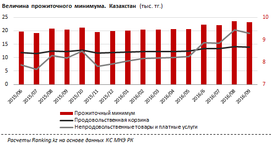 "Самый высокий уровень прожиточного минимума - 28 785 тенге - в Мангиустауской области, с индексом прироста к концу 2015 года в 117 процентов. Далее идут Астана и Алматы со средним прожиточным минимумом в 27 435 тенге и 25 858 тенге, где на Астану приходится индекс роста к итогу 2015 года на 121,4 процента", - привели такие данные аналитики. По их словам, средний уровень прожиточного минимума в Восточно-Казахстанской, Атырауской и Алматинской областях составляет 23 422 тенге.