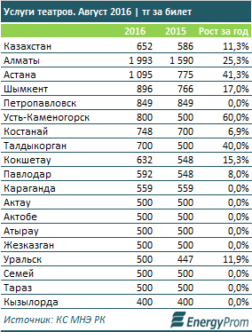 В свою очередь для театралов средняя цена за билет составляла в августе 652 тенге (рост на 11,3 процента за год). "Самые высокие цены на билеты в исследованных больших городах отмечены в Алматы (1 993 тенге, рост на 25,3 процента за год), Астане (1 095 тенге, на 41,3 процента) и Шымкенте (896 тенге, на 17 процентов). Самое значительное удорожание зафиксировано в Усть-Каменогорске (сразу на 60 процентов, до 800 тенге за билет)", - привели такие данные специалисты службы.