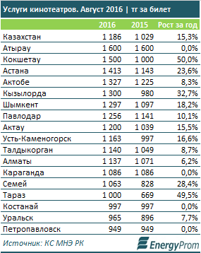 Билеты в кино в Казахстане подорожали за год на 15,3 процента, сообщают специалисты аналитической службы Energyprom.kz. По итогам августа, одно посещение кинотеатра обходилось зрителям в среднем в 1 186 тенге за билет.
