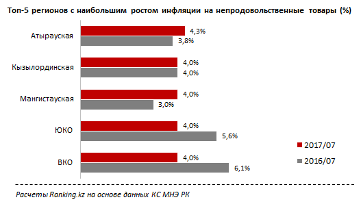 На непродовольственные товары наибольший прирост цен в этом году наблюдался на рынке Атырауской области - с декабря 2016 по июль 2017 они поднялись на 4,3 процента. В прошлом году прирост цен в регионе был менее значительным, на уровне 3,8 процента.