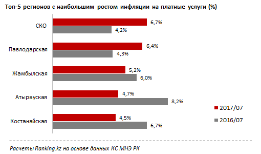 Наиболее активно в текущем году цены на товары и услуги росли в Павлодарской области. Прирост цен в июле по сравнению с декабрем 2016 года составил 5,2 процента.