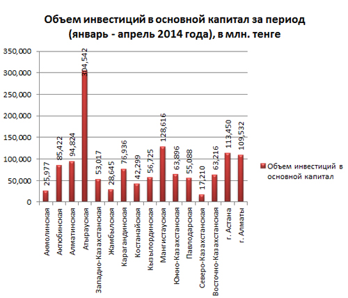 По данным Шурекеновой, лидерами по объему инвестиций в основной капитал за январь-апрель являются Атырауская область (304,5 миллиарда тенге), где удельный вес сотавляет 23 процента, и Мангистауская область (128,6 миллиарда тенге), где удельный вес сотавляет 10 процентов. "Как показывает мировая практика, территориальные различия естественны и объективны. Формируя условия межрегиональной конкуренции, территориальные различия способствуют повышению эффективности размещения производства, оптимизируют структуру расселения и рынков труда", - сказала она.