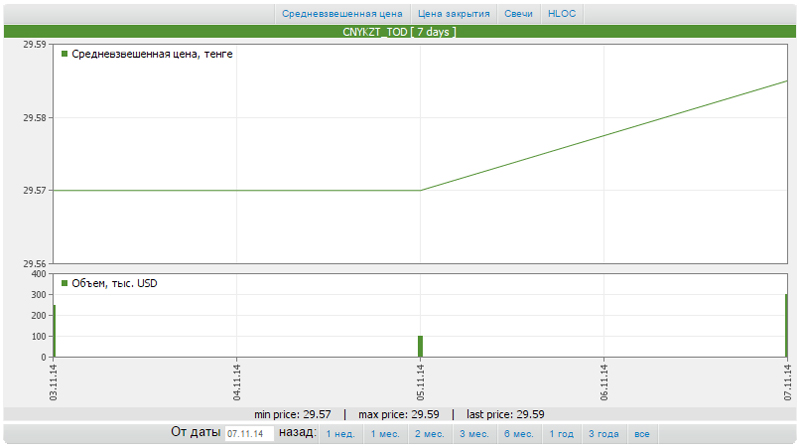 Позже торги по юаню опять не состоялись. Однако 7 ноября сделки по юаню были совершены на 300 тысяч (8,8 миллиона тенге). При этом отметим, что лучшие котировки на момент закрытия сессии на KASE составили 29,56/29,59 тенге за один юань.