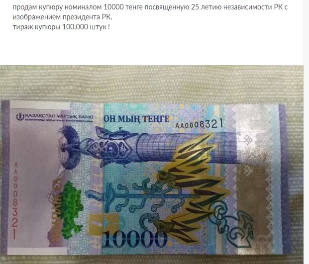 Объявления о продаже юбилейных банкнот номиналом 10 тысяч тенге с изображением Президента Казахстана Нурсултана Назарбаева появились в Сети, передает корреспондент Tengrinews.kz.