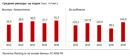 Уровень расходов на отдых внутри страны также увеличился, но не столь радикально. В 2016 году среднестатистический казахстанец тратил на отпуск, не выезжая за пределы РК, по 31,5 тысячи тенге, или на 14 процентов больше, чем в 2015 году.