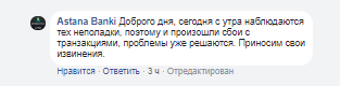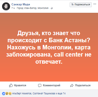 "Проблемы пока не решились (15.50 по времени Астаны - прим. авт.). Сегодня я заехал на заправку и хотел заправиться, расплатиться картой. У меня две карты Банка Астаны, и ни одна из них не прошла. Хотя везде положительный лимит. Я стал звонить в кол-центр, звонил очень долго - до 11.00. Также долго держал трубку на проводе - по пять-семь минут, но так никто и не ответил. Потом пошел в один из ТРЦ. Хотел попробовать расплатиться на кассе картой. Платеж не прошел. К этому времени в Банке Астаны уже ответили, что наблюдаются какие-то проблемы с платежной системой Master card. Ну, думаю, ладно, если оплата не проходит, дай попробую снять кэш в банкомате. Вставил карту в банкомат, но транзакция не прошла - как было написано, в связи с техпроблемами", - рассказал клиент банка.