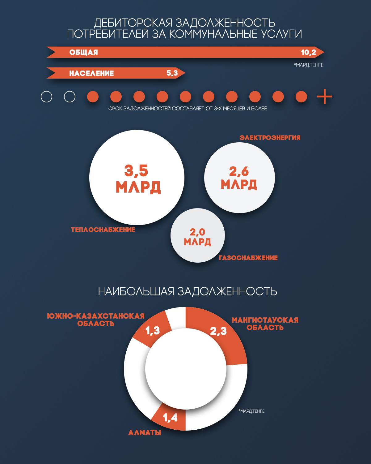Сообщается, что больше всего долгов накопилось за теплоснабжение - 3,5 миллиарда тенге, за электроэнергию - 2,6 миллиарда тенге и за газоснабжение - два миллиарда тенге.