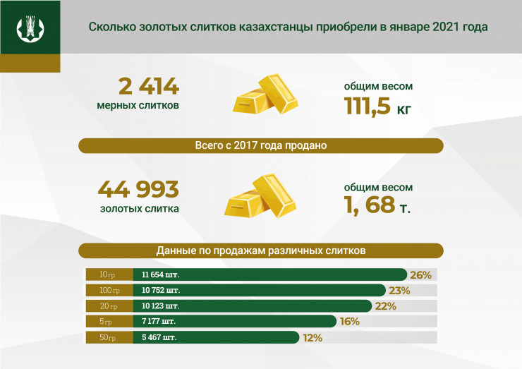 "Золотые слитки представлены в пяти разновидностях: 5, 10, 20, 50 и 100 граммов. С момента запуска программы наибольшей популярностью пользуется слиток весом 10 грамм. Его доля от общего объема продаж составляет 26 процентов - 11 654 штуки. Далее следуют 100-граммовые - 10 572 штуки (23 процента) и 20-граммовые - 10 123 штуки (22 процента), 5-граммовые - 7 177 штук (16 процентов), 50-граммовые - 5 467 штук (12 процентов). В основном мерные слитки пользуются спросом в Алматы, Нур-Султане и Атырау.