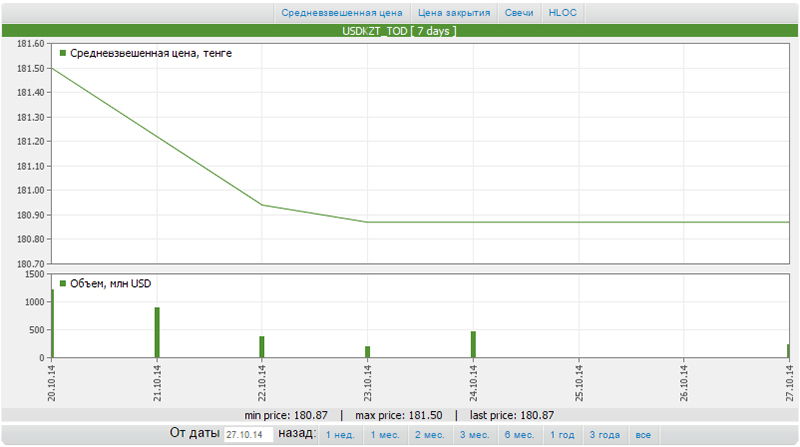 Напомним, недавно появились слухи о повторной девальвации тенге в связи со снижением цен на нефть и падением рубля по отношению к доллару. Среди населения опять наблюдался ажиотаж, многие скупали доллары в обменниках. При этом на KASE 20 октября было продано около 1,3 миллиарда долларов. Сделки по паре доллар/тенге были заключены по курсу 181,50-181,70 тенге за доллар. Только во время утренней сессии на бирже объем торгов долларами составил 710 миллионов. Эксперты отмечали, что увеличение объема торгов на KASE связано со слухами о повторной девальвации, которые в последние дни резко начали муссироваться среди населения.