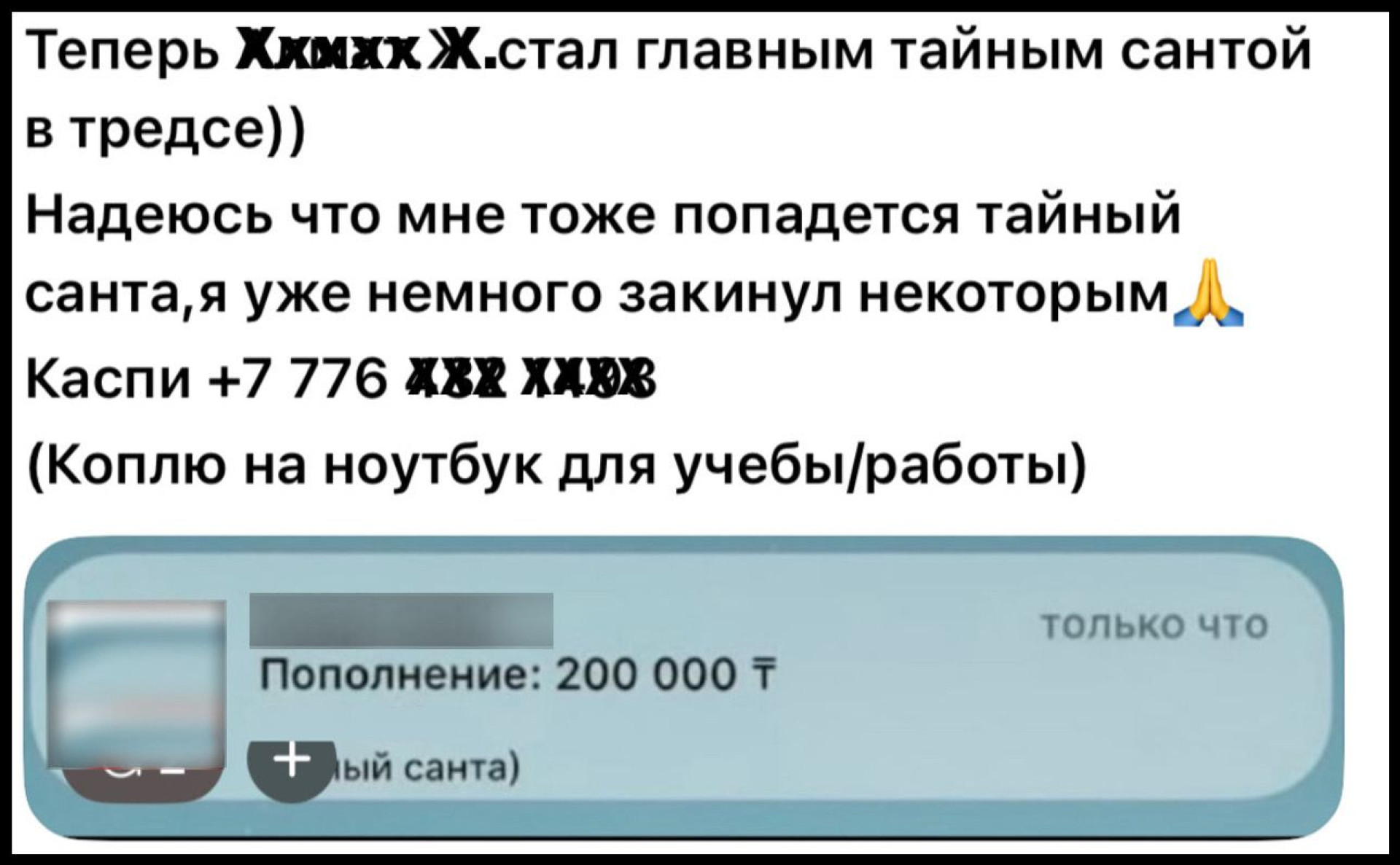 В соцсетях набирает популярность новый тренд — "Тайный Санта": казахстанцы делятся номерами своих карт в надежде получить неожиданные денежные "подарки" от незнакомцев. Tengri Life узнал, как работает тренд и какие риски он несёт.