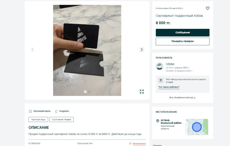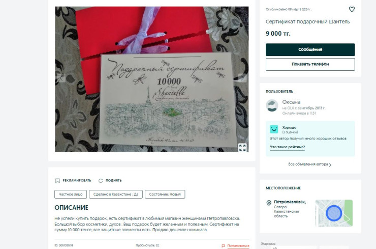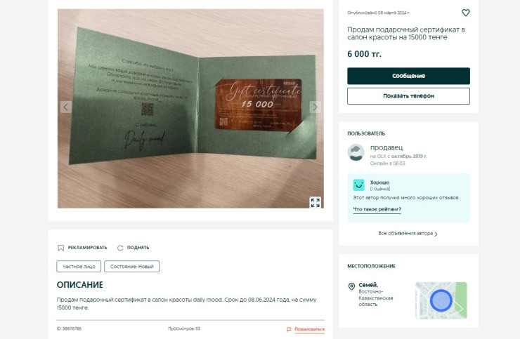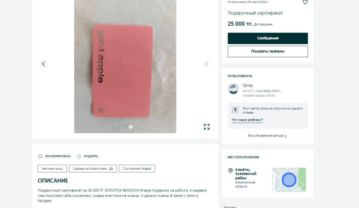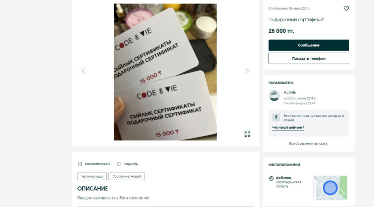 Авторы объявлений предлагают приобрести сертификаты по заниженным ценам. К примеру, сертификат стоимостью 10 тысяч тенге счастливая обладательница предлагает приобрести за 8 тысяч.