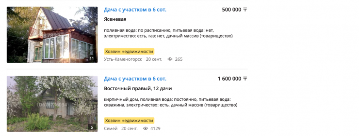 Деревянную постройку с участком до шести соток можно купить как под Карагандой, так и под живописным Усть-Каменогорском. Отметим, что цены начинаются от 500 000 тенге, то есть обзавестись дачей можно и за меньшие деньги.