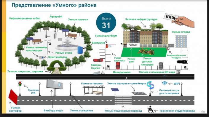 По замыслу, благодаря внедрению новых технологий будут созданы улучшения по 10 направлениям: благоустройство (теплые тротуары, подогрев дорог), "умное" пешеходное и транспортное планирование, цифровое - мобильное предпринимательство, "умная" инфраструктура (освещение, ливневая канализация), экологические решения (раздельное хранение мусора), безопасность и так далее.