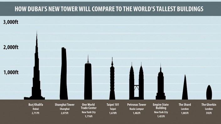 В Дубай планируют побить собственный рекорд и построить башню, которая превзойдет по высоте самое высокое строение в мире - небоскреб Бурдж-Халифа, ранее возведенный в этом же эмирате ОАЭ. Об этом сообщает Agence France-Presse.