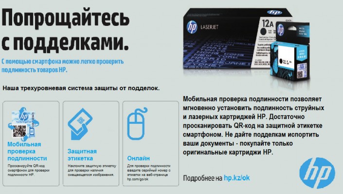 Отличить подделку от оригинала просто - с помощью 3D-голограммы. Второе - злоумышленники иногда используют оригинальную упаковку повторно, поэтому проверяйте ее. Третье - цена. Оригинальный картридж HP никогда не будет стоить дешево. Далее - мобильное приложение HP Mobile Authentication. Отсканируйте QR-код и получите мгновенный результат либо введите серийный номер по этой ссылке.