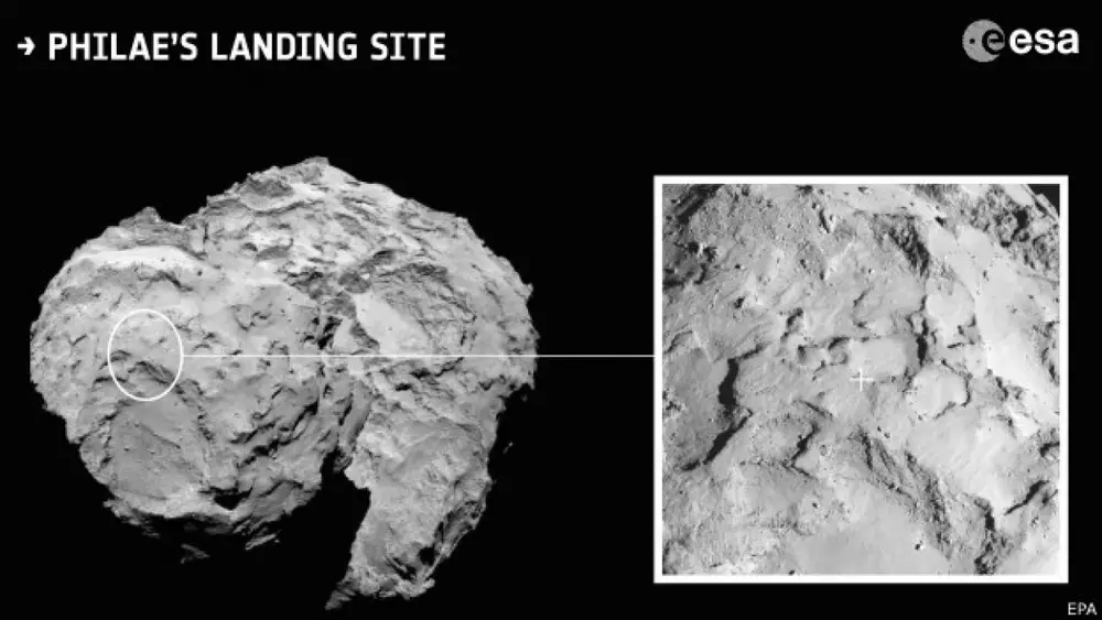 По предварительным данным, вероятность успешной посадки составляет 70-75 процентов. Спускаемый модуль будет цепляться к поверхности кометы с помощью винтов и гарпунов - на комете очень маленькое гравитационное притяжение. По плану, 100-килограммовый зонд "Розетты" должен высадиться на комету 11 ноября. Если все пройдет успешно, то ожидается, что "Фила" проработает на поверхности ядра кометы в течение года.