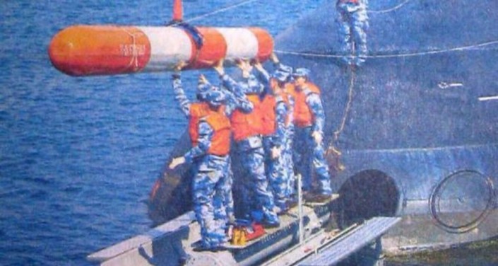 На фото видно, как моряки загружают торпеду в носовой отсек корабля. © China Defense Forum