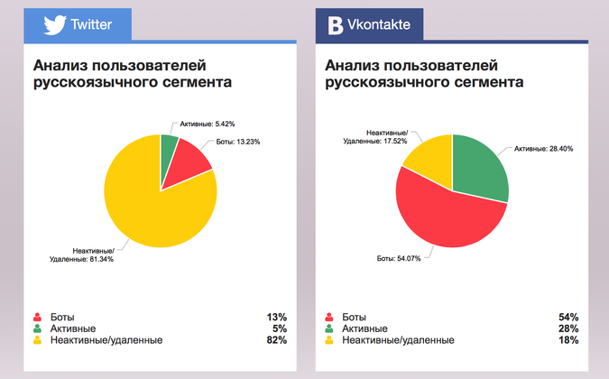 В русскоязычном сегменте Twitter набралось лишь 5,42 процента активных юзеров. "Боты" составили 13,32 процента микроблогов, а остальные 81,34 процента пришлись на неактивные и удаленные аккаунты. В соцсети "ВКонтакте" картина совершенно другая. "Боты" составили 54,07 процента от общего числа пользователей, на настоящие и активные страницы пришлось 28,40 процента, а на неактивные и удаленные - 17,52 процента.