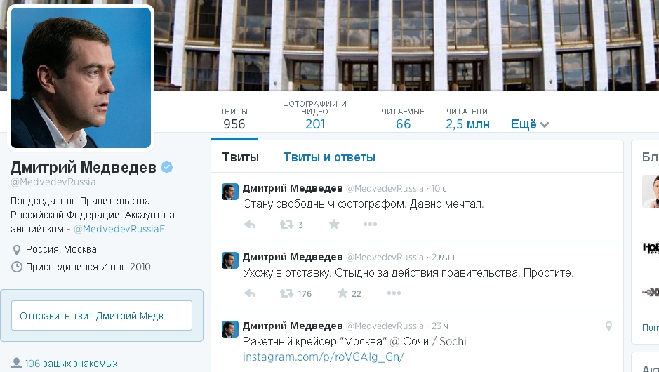 Аккаунт премьер-министра России Дмитрия Медведева в микроблоге Twitter взломали, передает корреспондент Tengrinews.kz.