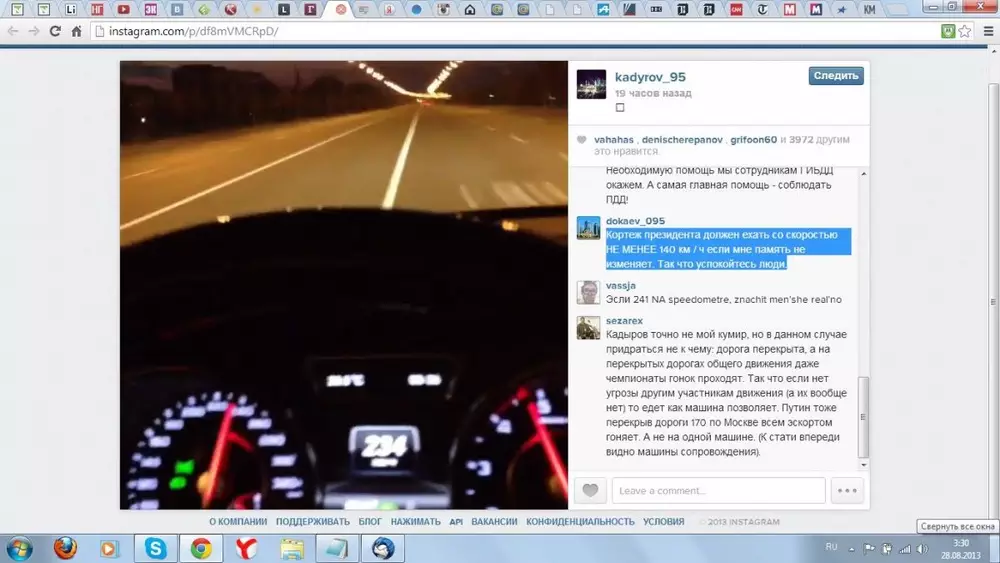 Поводом к предъявлению претензий послужило видео, выложенное Кадыровым на своей странице в Instagram. Сам глава Чеченской республике в кадре не виден, зато отчетливо слышен характерный голос и видны показания спидометра.