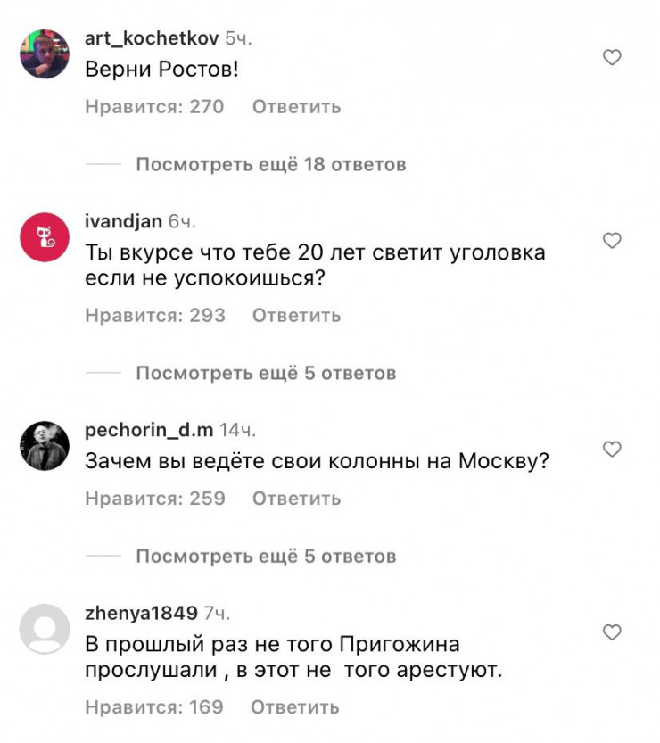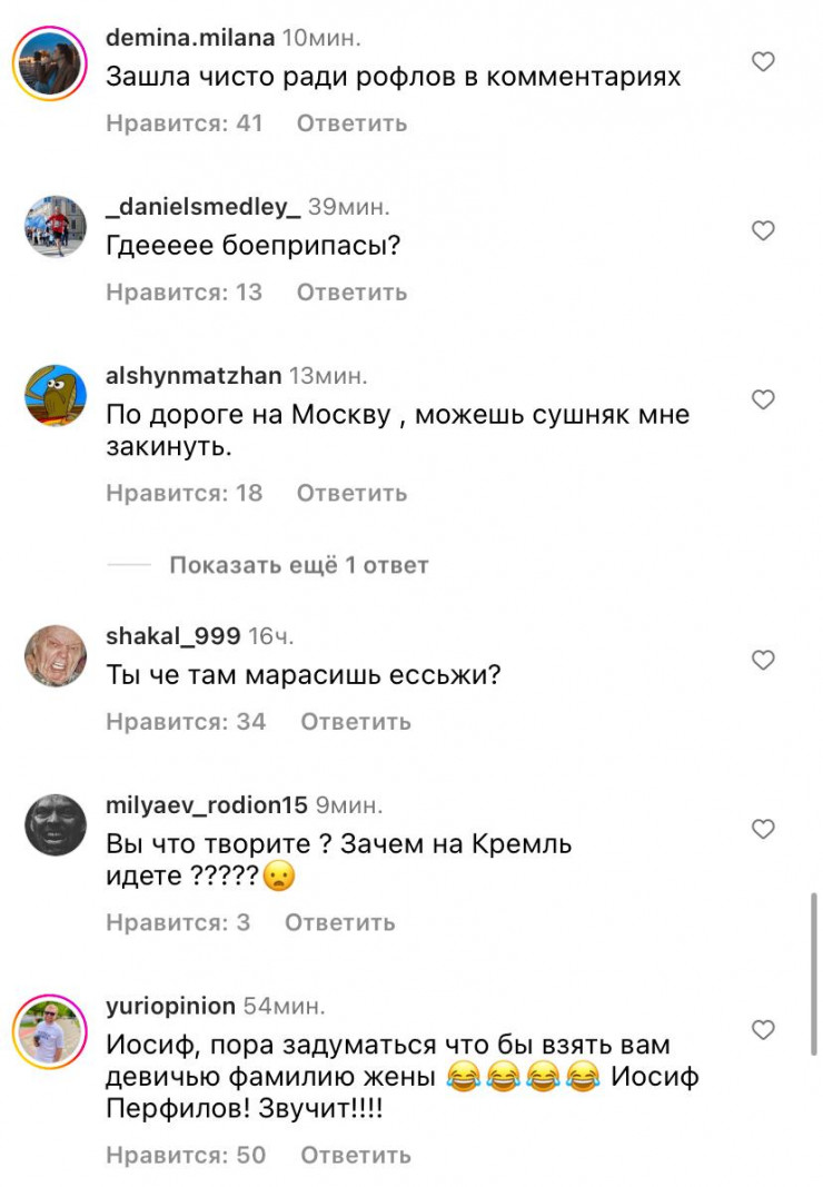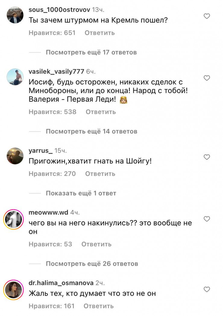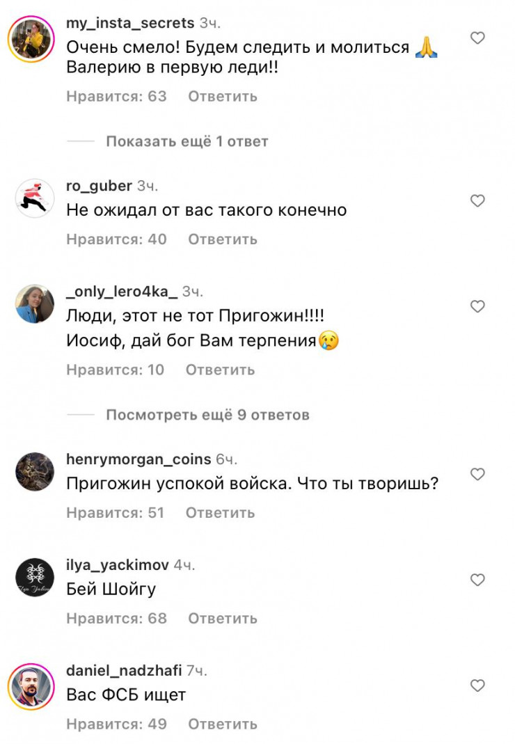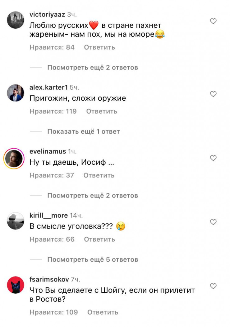 Под публикациями на странице Иосифа Пригожина начали появляться многочисленные комментарии о мятеже в России. Видимо, пользователи сети специально "перепутали" Пригожиных и так решили пошутить.