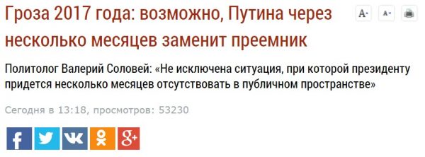 Днем 10 ноября газета "Московский комсомолец" опубликовала интервью с политологом Валерием Соловьем, который заявил, что в 2017 году президента России Владимира Путина может заменить другой человек. Однако позже материал по неизвестной причине был удален. Хотя в кэше Google по-прежнему есть копия страницы. Судя по ней, интервью успели прочитать не менее 50 тысяч пользователей.