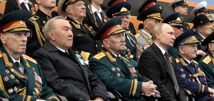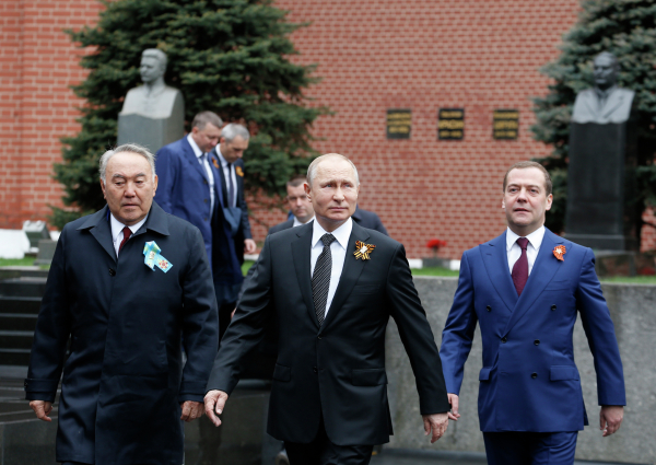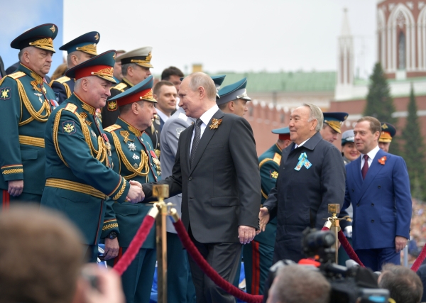 На главную трибуну в Москве Нурсултан Назарбаев вышел вместе с президентом России, верховным главнокомандующим Владимиром Путиным и премьер-министром РФ Дмитрием Медведевым.