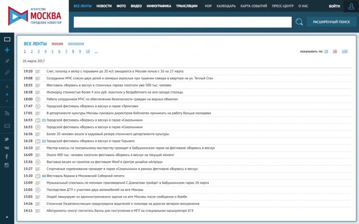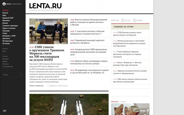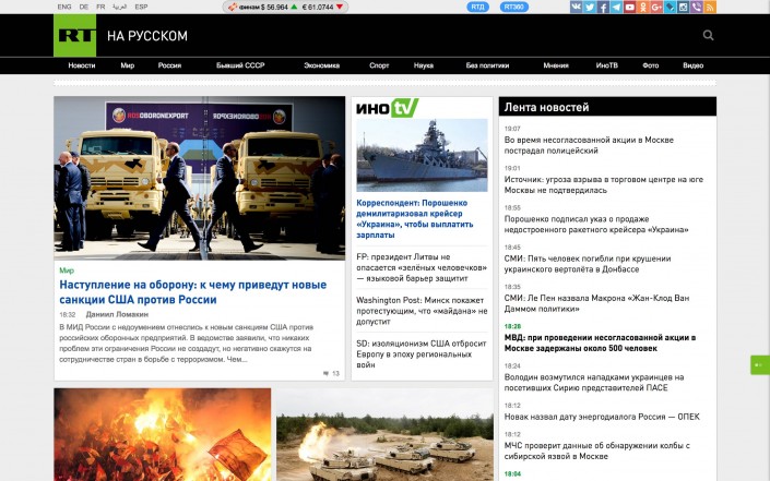 Сайт канала RT в 18.28 сообщил о 500 задержанных, а в 19.07 - о пострадавшем полицейском. На главной странице Lenta.ru появились целых три новости о митингах в Москве: о безукоризненной работе полиции, о газовом пистолете, обнаруженном у одного из протестующих, и о том, что МВД назвало число участников акции (без указания этого числа).