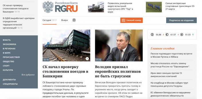 Так, сайт телеканала "Россия 24" сообщал о событиях в Донбассе и нападении на бойцов Нацгвардии в Чечне, совершенном накануне. "Российская газета" писала о столкновении поездов в Башкирии. А сайт НТВ предлагал посмотреть интервью с Андреем Колесниковым и сюжет о "Евровидении".