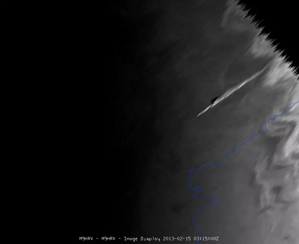 Метеорит, упавший утром 15 февраля на Челябинскую область, сфотографировал геостационарный метеоспутник Meteosat-9. Об этом сообщила Европейская организация спутниковой метеорологии (EUMETSAT), опубликовавшая на своем сайта фотографию болида. На снимке четко видно облако пара, возникшее в результате сгорания небесного тела в земной атмосфере.