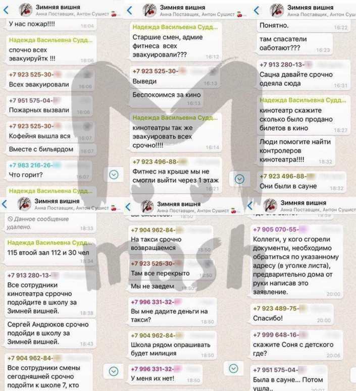 В Сети появились скрины сообщений из общего чата в WhatsApp, в котором якобы состояли сотрудники и администрация сгоревшего торгового центра в Кемерово. Скриншоты опубликовал Telegram-канал Mash.