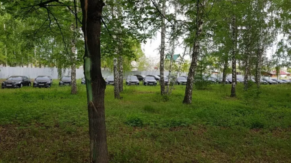 Абсолютно все иномарки черного цвета, внешне абсолютно одинаковые. Машины представительского класса стоят прямо под открытым небом и деревьями, припаркованы на участке рядом с озером Смолино.