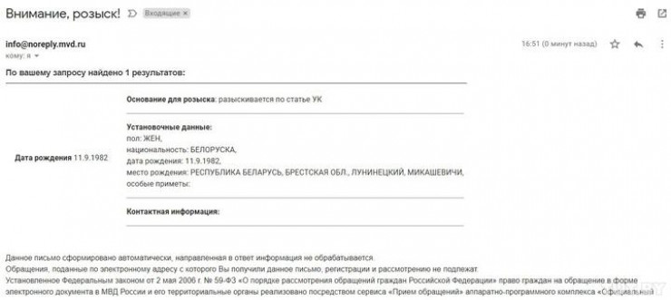 В случае если Тихановская появится на территории России, она будет задержана. Как указано в примечании, главная соперница Александра Лукашенко разыскивается по статье Уголовного кодекса, какой - неизвестно.