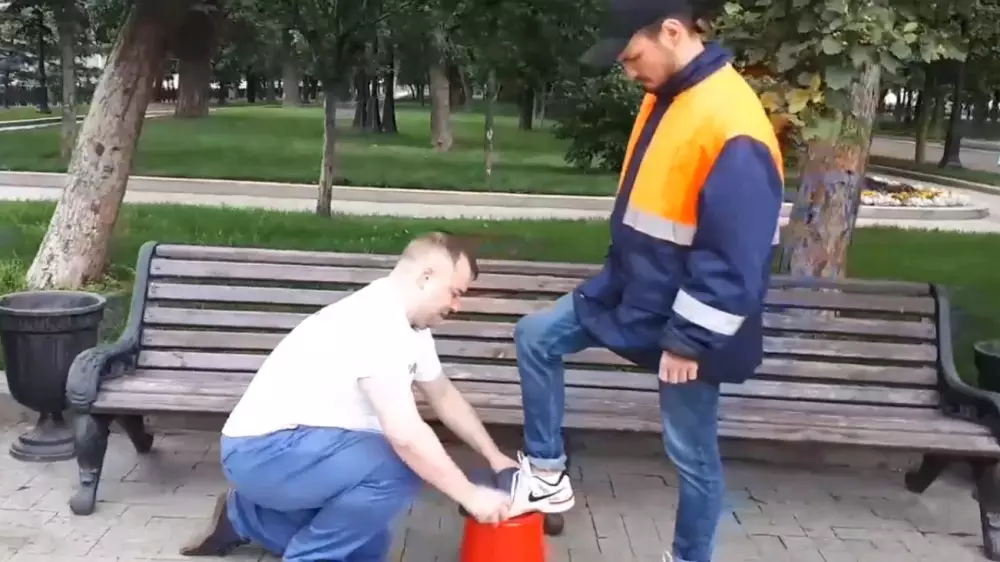 На своей странице в соцсети "ВКонтакте" москвич наглядно показал, как необходимо относиться к приезжим из соседних республик, встав перед человеком в оранжевой робе на колено и почистив ему обувь.