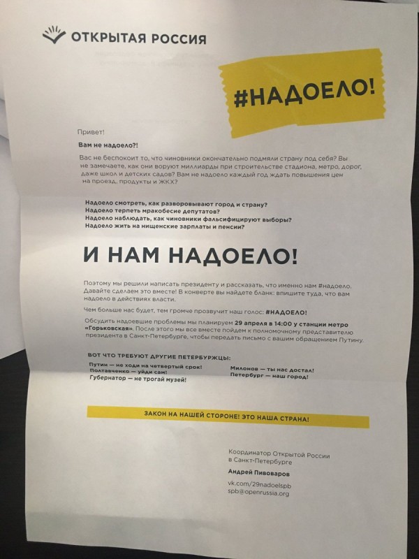 В субботу, 29 апреля, в Москве, Санкт-Петербурге и других городах России прошли несогласованные протестные митинги под лозунгом "Надоел", объявленные Михаилом Ходорковским и движением "Открытая Россия". Цель акции, как указали ее организаторы, - показать Владимиру Путину, что многие выступают против его участия в следующих президентских выборах. О том, как прошли митинги, подробно рассказали на сайте "Открытой России", а также "Эхо Москвы", Meduza, телеканал "Дождь", РБК и ряд других СМИ.