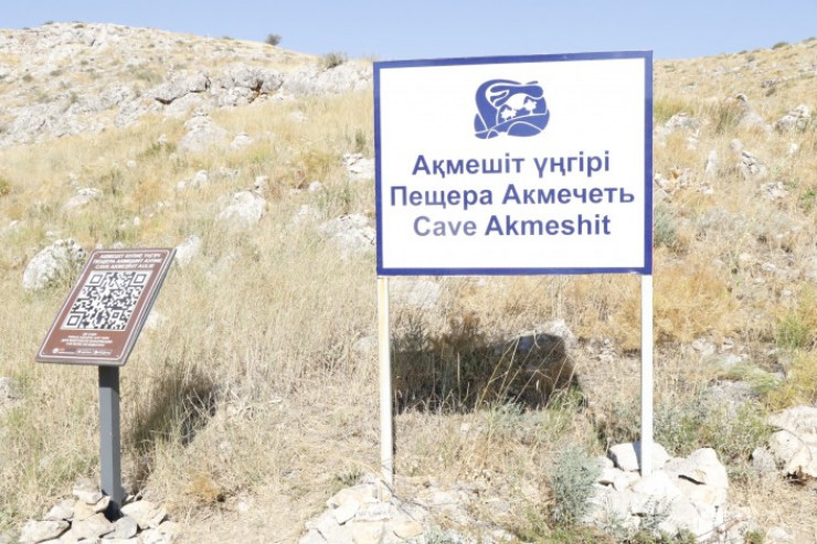 Пещера Акмешит представляет собой большой зал глубиной примерно 150 метров, шириной около 65 метров и высотой под 30 метров. Уникальность пещеры в том, что в ней растет небольшая роща, около 40 деревьев. Здесь в любое время года практически одна и та же температура. К тому же открывающаяся во внешний мир панорама напоминает шанырак юрты. По дороге есть возможность увидеть Байдибекскую впадину, мавзолей Домалак-ана, мавзолей Байдибек-ата и Кос-ана.