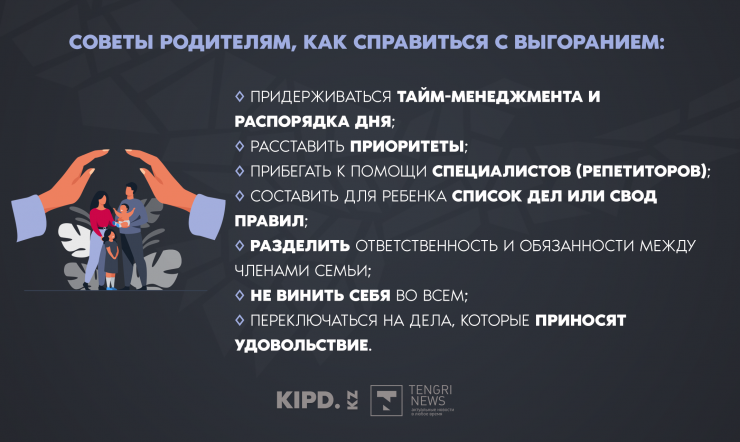 Разделение ответственности и обязанностей между членами семьи. По словам Сандугаш Кудайбергеновой, зачастую в семьях идет перекос в сторону мамы. И обучение ребенка, как и другие обязанности по дому, ложится на ее плечи. При правильном распределении обязанностей эмоционального выгорания можно избежать.
