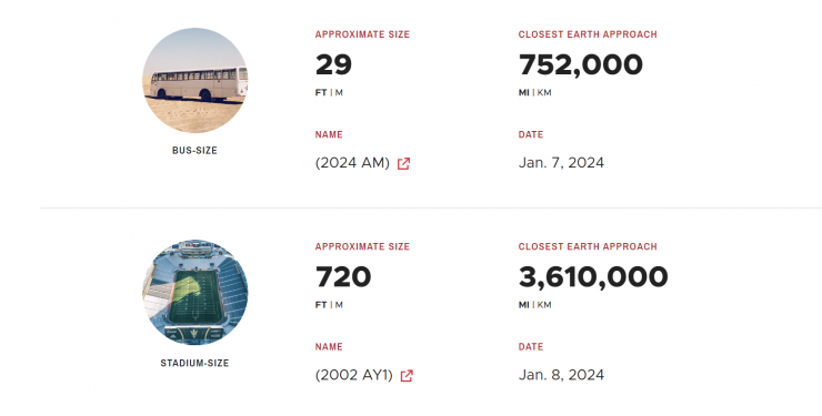 Панель управления Asteroid Watch отслеживает астероиды и кометы, которые приближаются к Земле относительно близко. На приборной панели для каждого столкновения отображается дата наибольшего сближения, приблизительный диаметр объекта, относительный размер и расстояние от Земли.