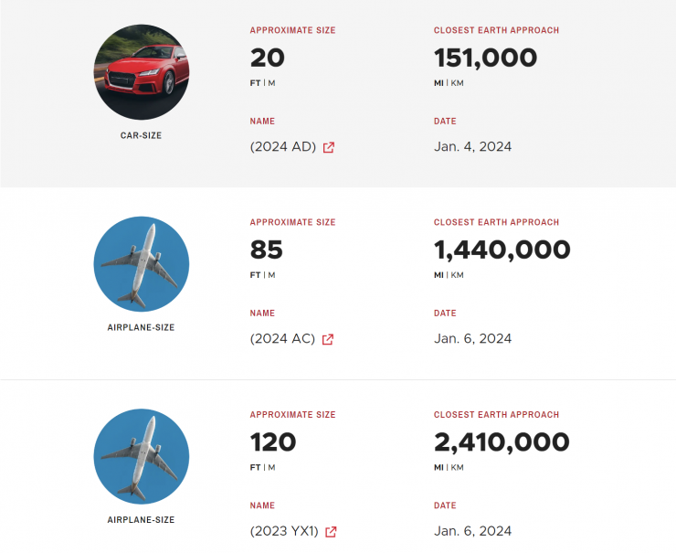 Следующее сближение произойдет 6 января, на расстояние 1,44 миллиона километров приблизится 85-метровый астероид, чей размер сопоставим с самолетом. В тот же день на расстояние 2,41 миллиона километров приблизится астероид 2023 YX1, тоже размером с самолет, но уже 120-метровый.