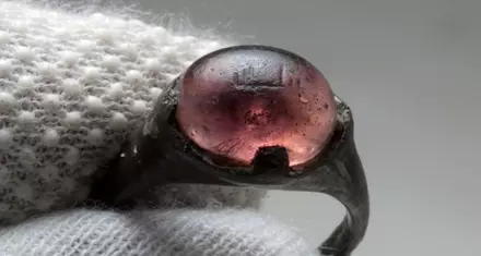Сначала археологи предположили, что камень в кольце сделан из фиолетового аметиста. Однако позже эксперты с помощью электронного микроскопа выяснили, что материалом послужило цветное стекло - редкий в те времена материал.