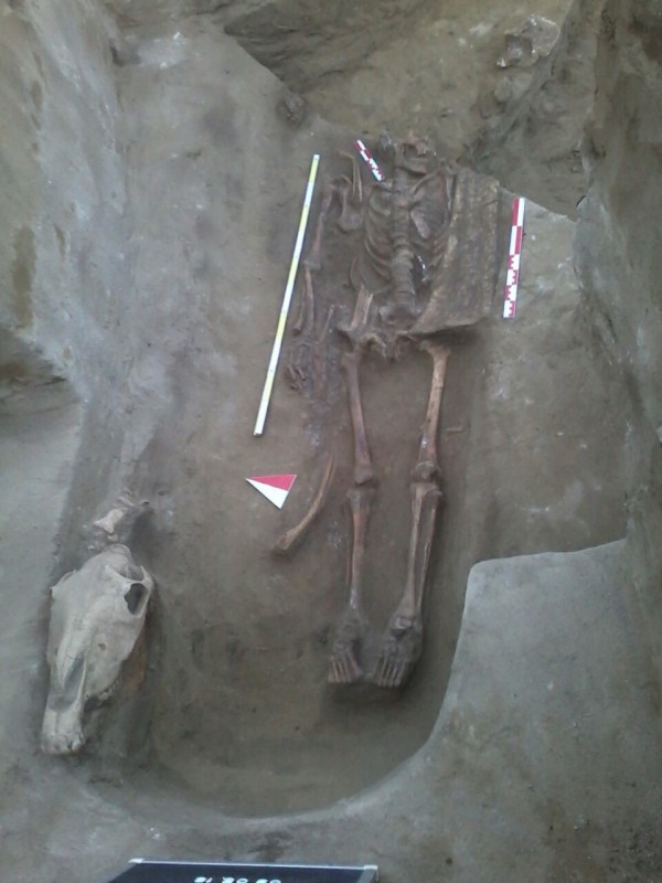 "В двух могилах погребены мужчины - воины, при которых обнаружены останки головы лошади с железными удилами, фрагменты наконечников стрел, колчанов, а также костяные пряжки. Третье захоронение принадлежит женщине, кроме ее останков на дне ямы найдена баранья голова, кольцо и часть костяной прялки", - рассказал Рыбальченко.