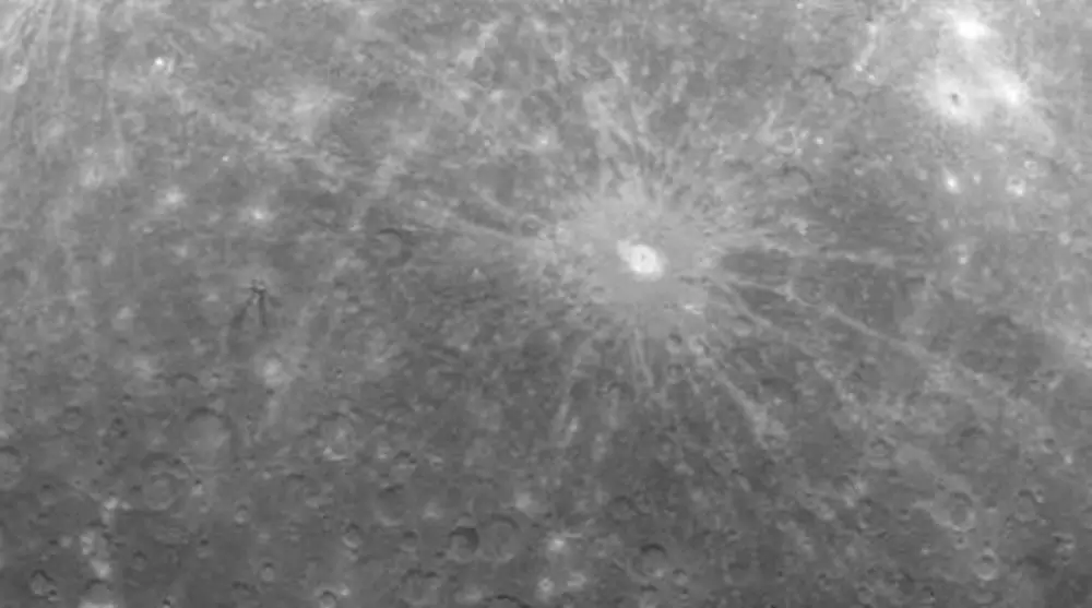 В НАСА отметили, что в течение шести часов спутник сделал более 360 снимков. В момент съемки аппарат находился над южным полюсом Меркурия. На первой фотографии виден кратер Дебюсси и территория у южного полюса, которая раньше никогда не находилась в зоне видимости зондов. Разрешение снимка составляет 2,7 километра на пиксель. Снимок сделан камерой WAE.