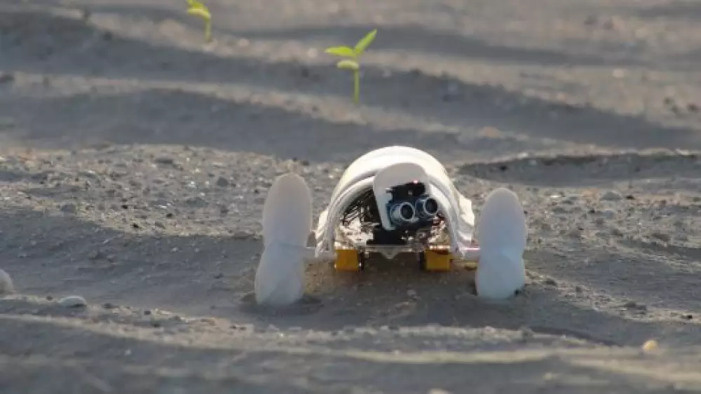 Робот перемещается по песку в поисках правильных уровней влаги для посадки семян. Помимо датчика влажности почвы, крошечный робот оснащен датчиком расстояния - он отправляет отчеты пользователю для статистических данных.