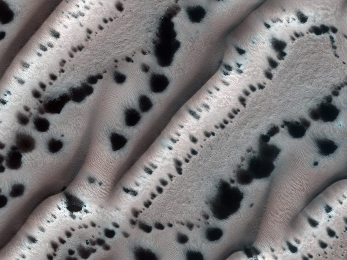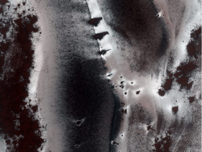 Осенью и зимой морозы покрывают дюны в 34-километровом кратере Ричардсона в южной полярной области Марса. Темные полосы и пятна - это области, которые оттаивают в местах, где сезонный лед уступает место песчанику.