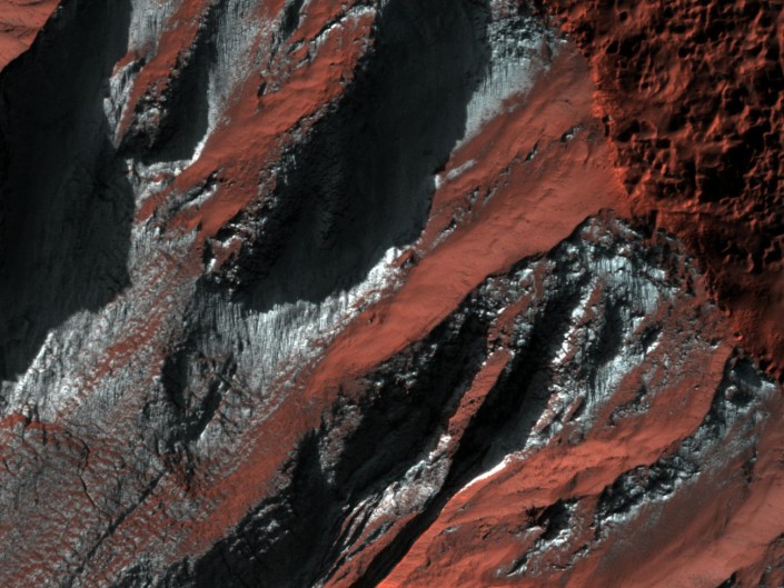 Падающие температуры приносят изменения на Марс, поскольку атмосфера из углекислого газа превращается в сухой лед, который цепляется за поверхность. Марсианский разведывательный спутник (Mars Reconnaissance Orbiter) использовал самые мощные камеры и спектрометры для съемки зимних пейзажей на Красной планете.