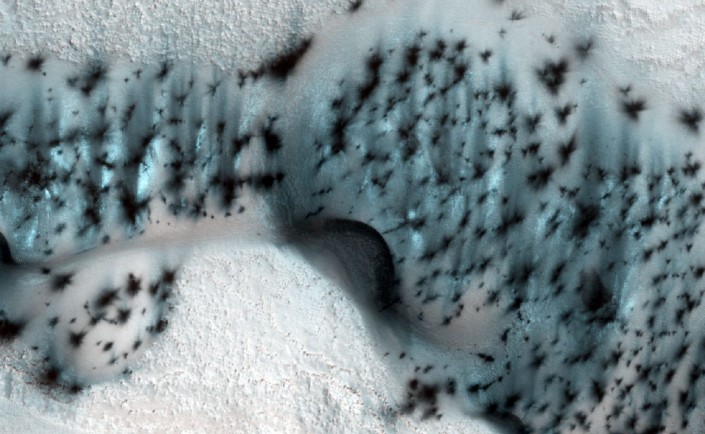 Треугольные пятна, которые выглядят как линии сосновых деревьев, являются сложными узорами, создаваемыми, когда зима превращается в весну, а замороженный углекислый газ Марса начинает испаряться и обнажать твердую поверхность планеты.