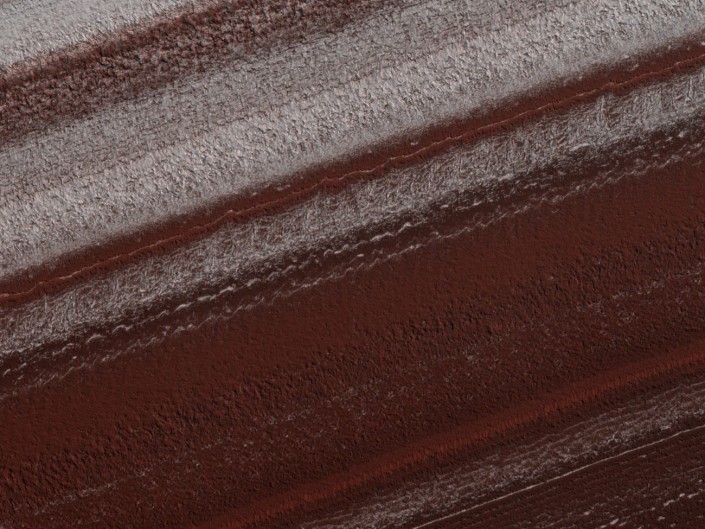 Слои пыльных ледяных залежей на марсианском Северном полюсе имеют толщину в несколько миль. Мороз на стенке впадины, которая врезается в эти отложения, выделяется в отдельные слои.