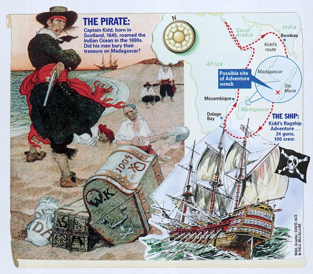 По легенде знаменитый шотландский пират XVII века (1654-1701) прежде чем быть арестованным и казненным, по разным версиям, сумел спрятать клад стоимостью от 100 тысяч до 12 миллионов фунтов стерлингов. В балладе "Прощание капитана Кидда с морями" 1701 года упоминаются 200 слитков золота и большое количество наличных денег.